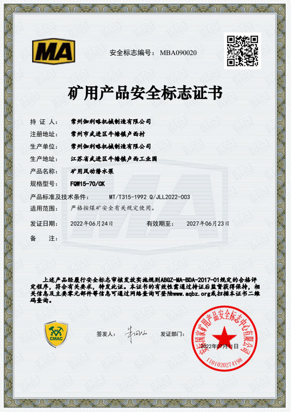 • 礦用安全標志證書-FQW20-50/K